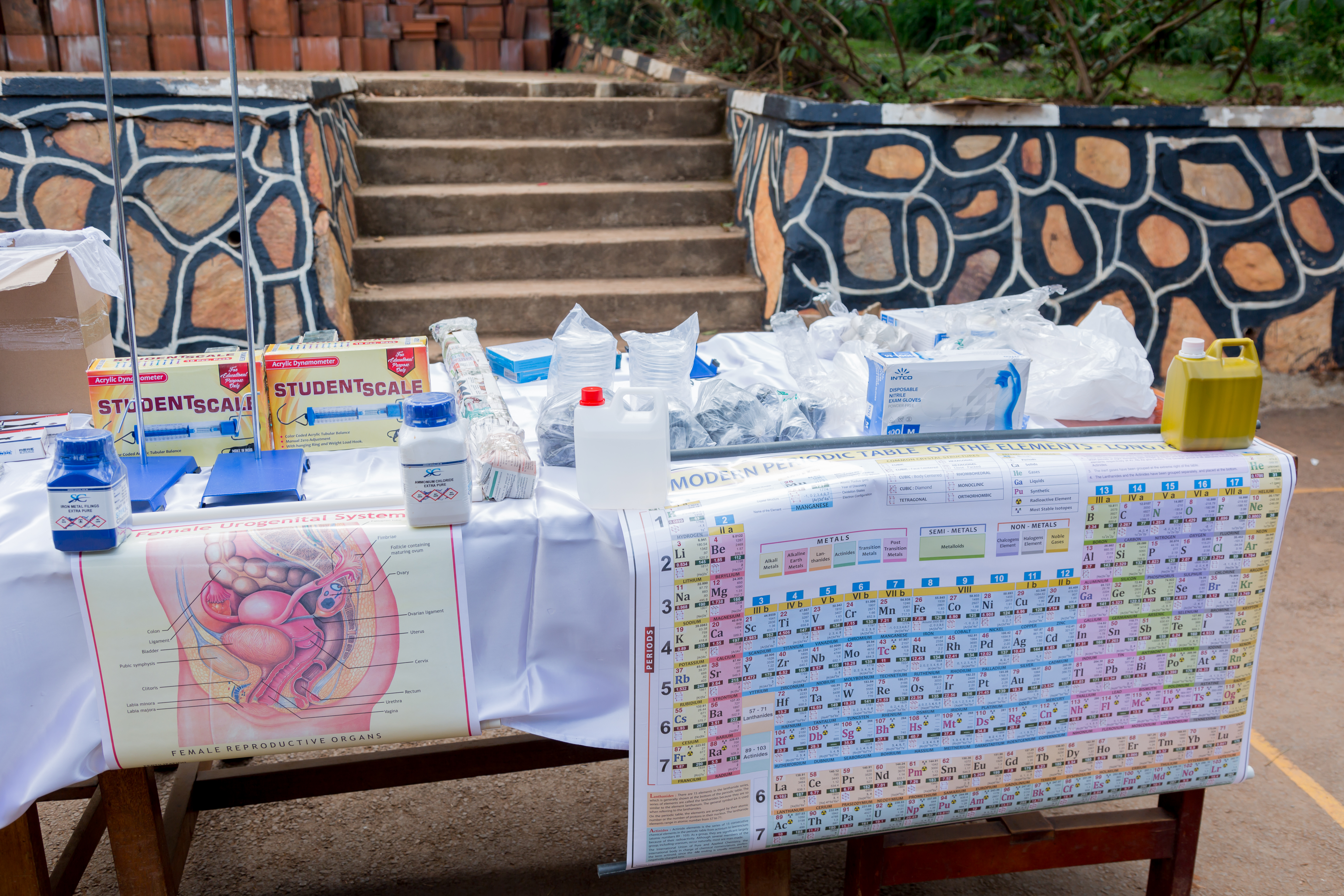 Donated science equipment lined up, ready to be handed over to Mackay Memorial College.