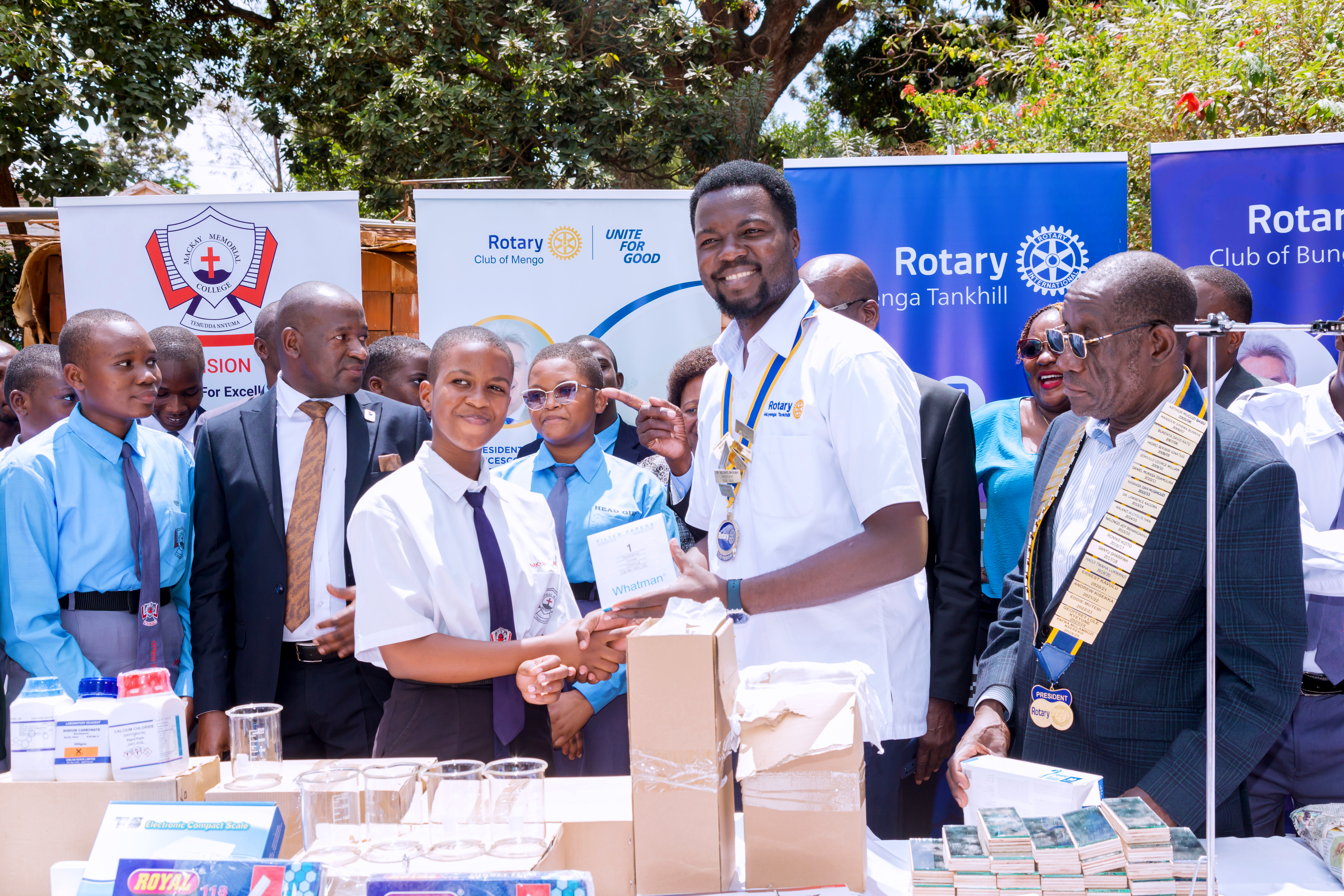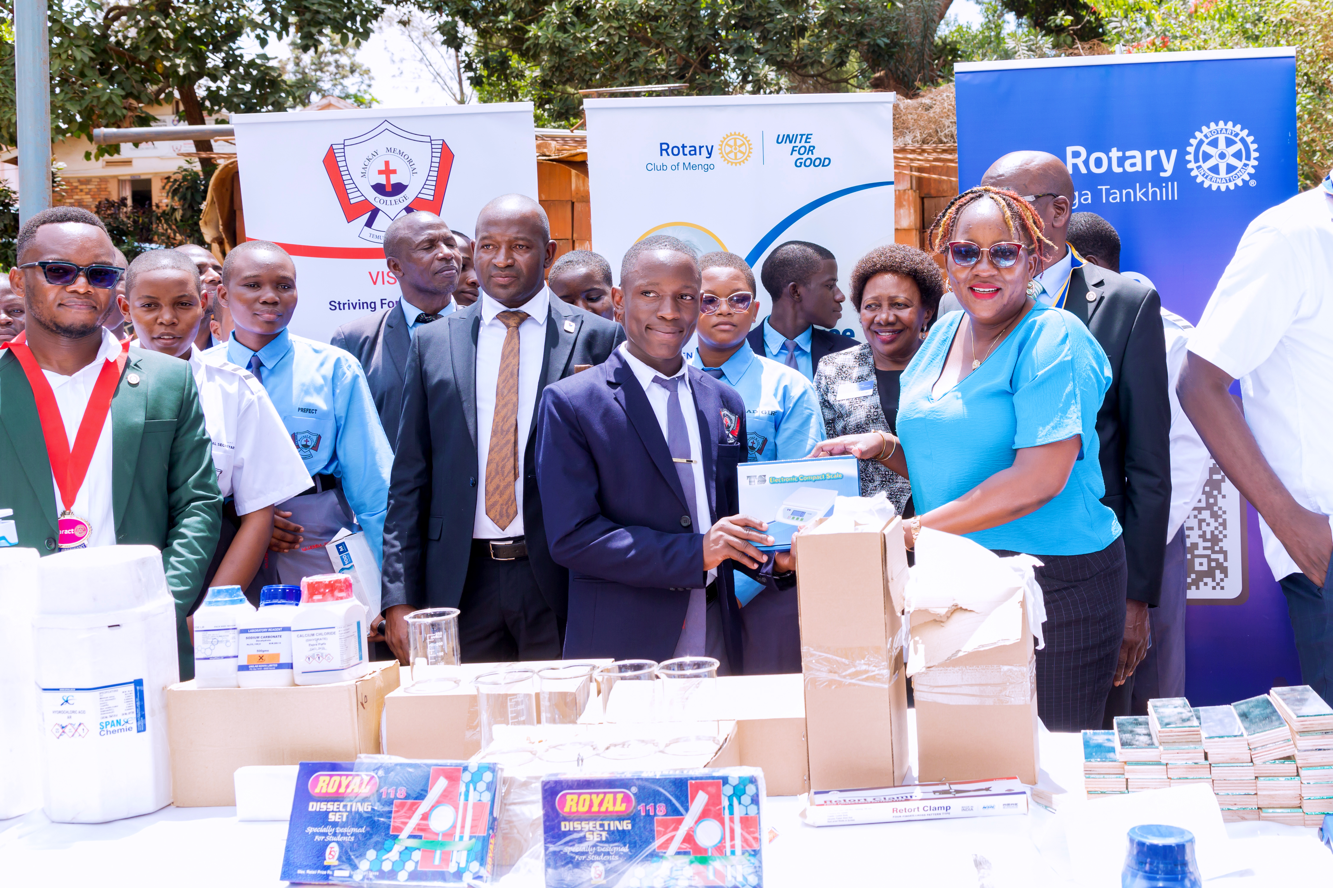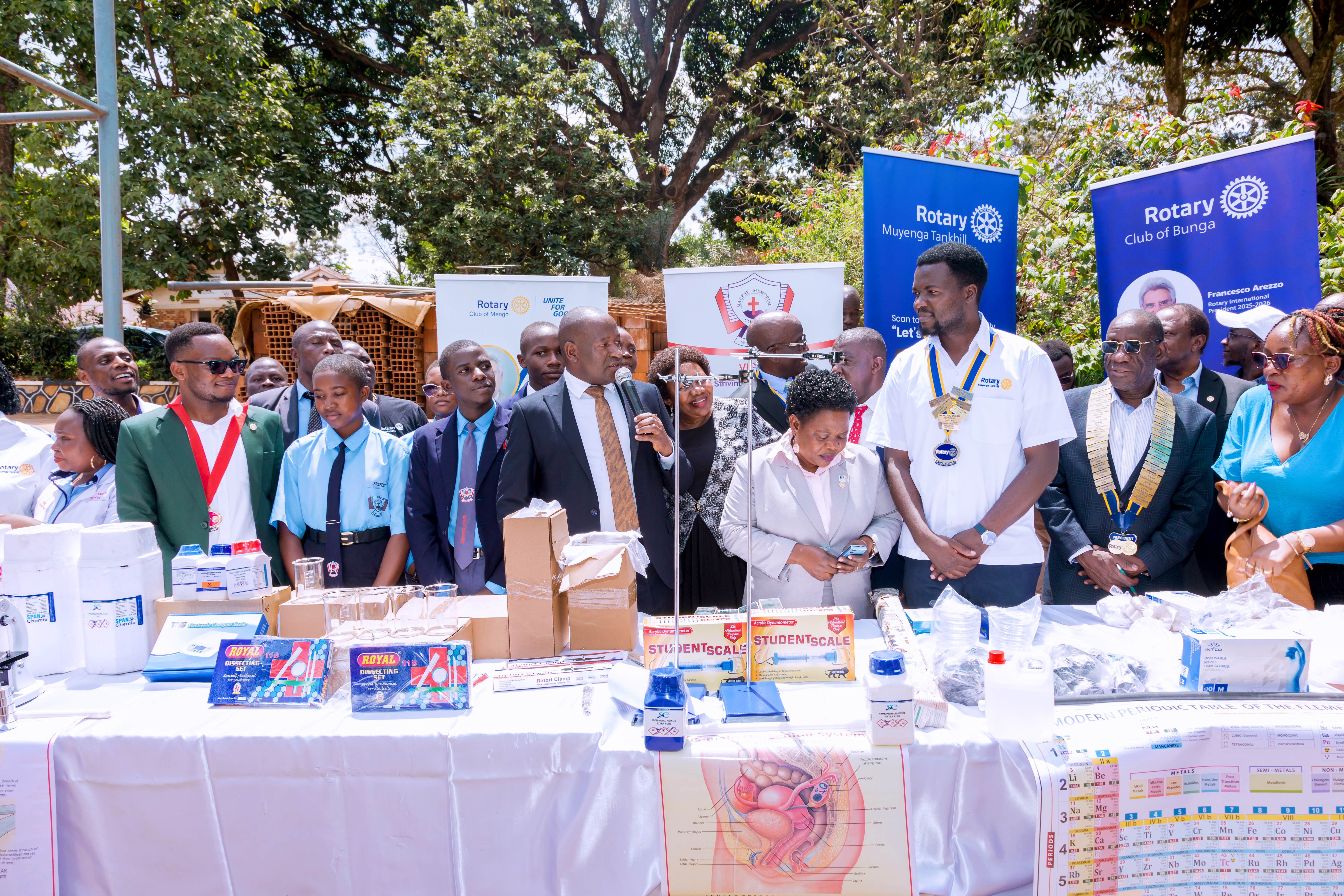 Leaders, teachers, and students engage with the donated science equipment during the ceremony.